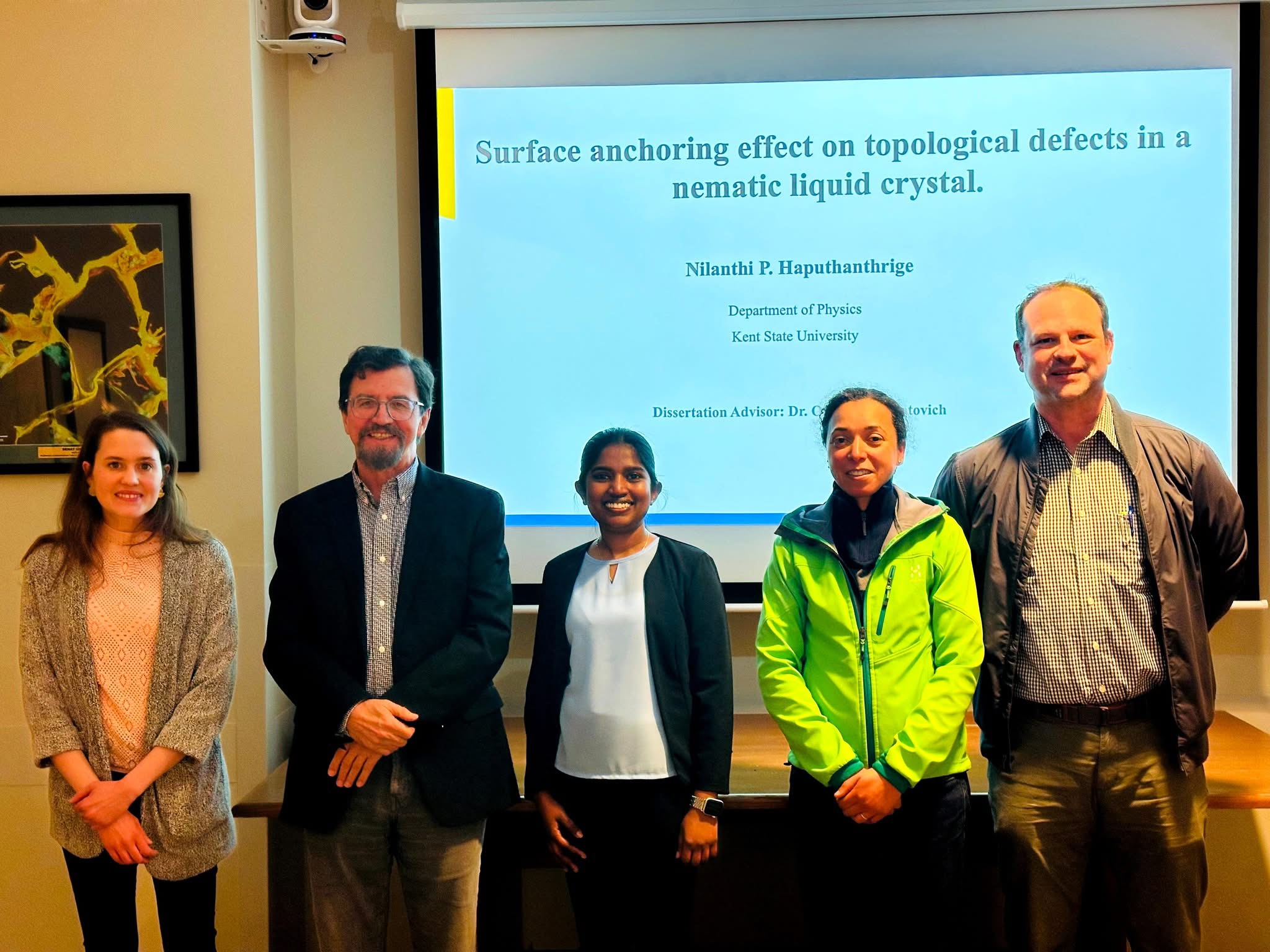 Nilanthi P. Haputhanthrige successfully defended her Ph.D. dissertation on "Surface anchoring effect on topological defects in a nematic liquid crystal". Congratulations Dr. Haputhanthrige! March 12, 2025