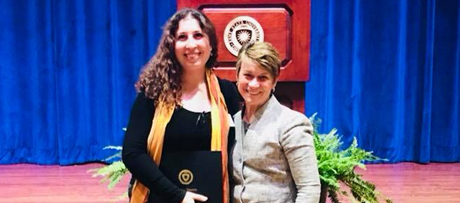 President Warren of Kent State University with Greta Babakhanova who received the 2017 Graduate Research Award for her research on "Programmable stimuli responsive dynamic 'skin' that controls particle transport".